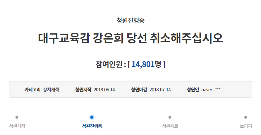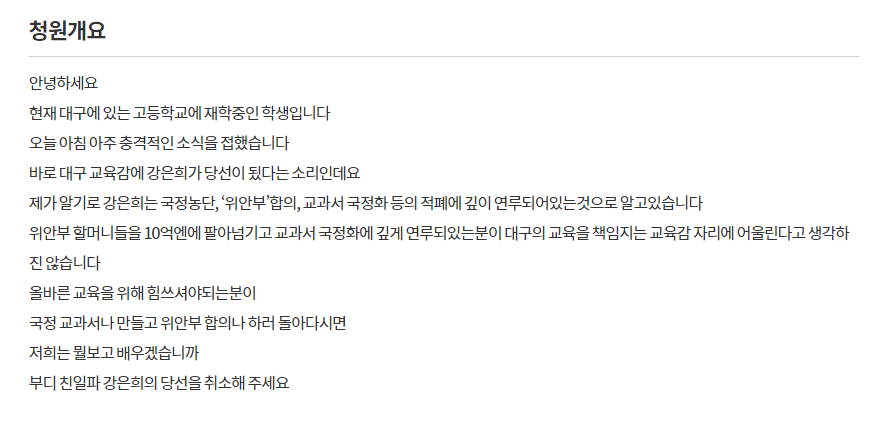 저 강은희 교육감이랑은 관련없는 이야기이긴한데 저 국민청원은 그냥 대국민 드립 경연장으로 변질 된지 오래인 것 같습니다.. 누굴 사형시켜달라는 글이 올라오질 않나..