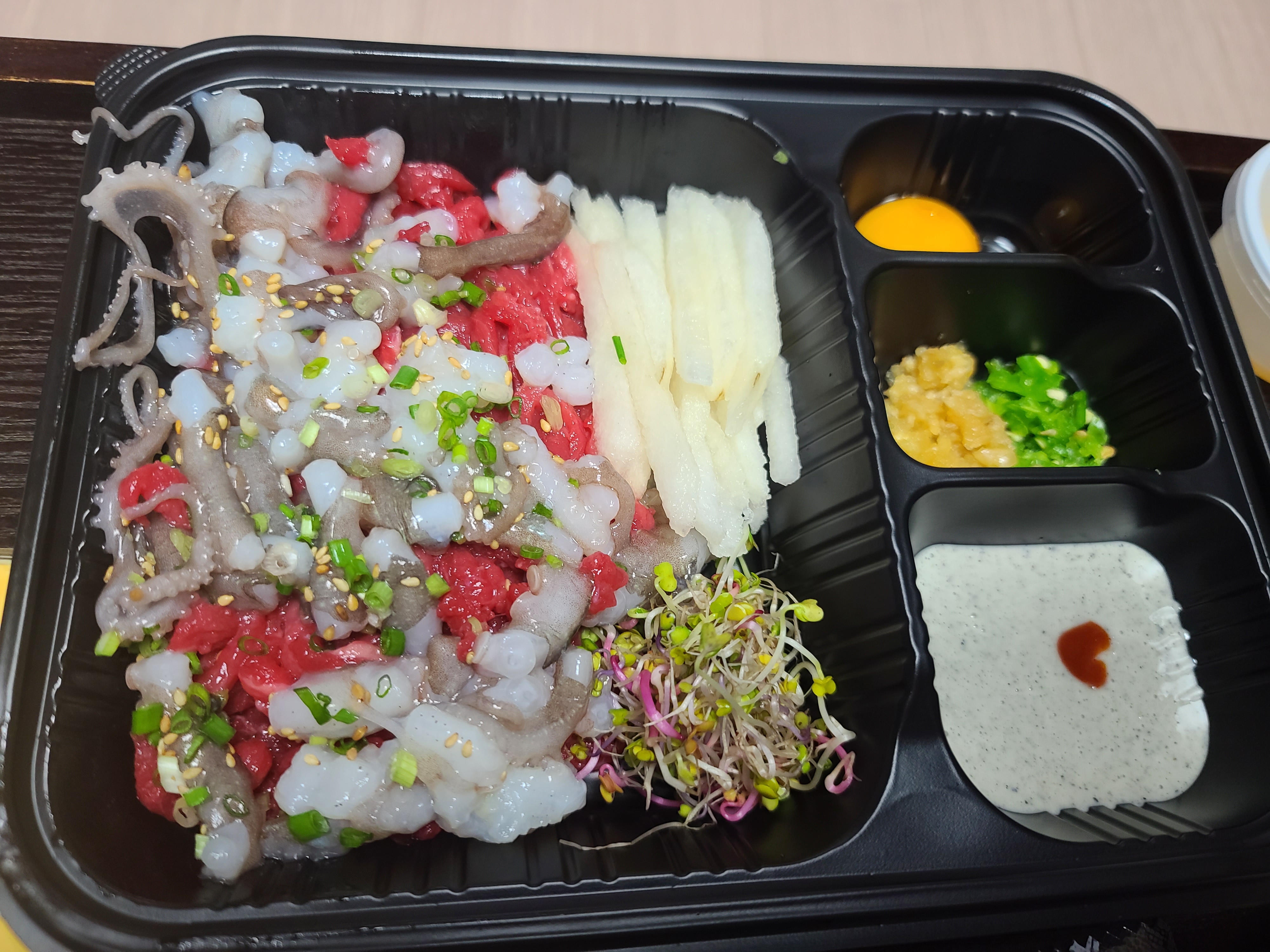 산낙지와 육회의 조합~ 각각 날것으로 먹는 음식을 함께 먹을 수 있다는 생각 한번도 해본적이 없는데~ 맛이 어떨가 궁금하네요~