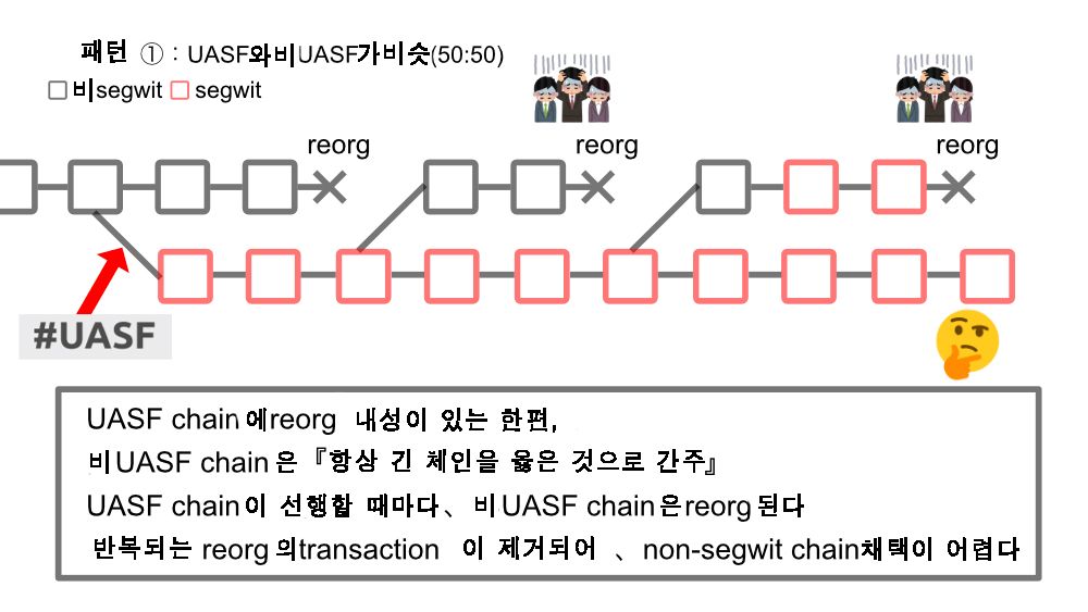 가장 위험한 것은 패턴 ① 이라고 생각될 수도 있지만, 오히려 패턴 ③입니다. 패턴 ①은 이미 non-USAF chain에게는 네트워크의 실질적인 붕괴이기 때문에 UASF chain로 전환할 수 밖에 없습니다. 그러나 패턴 ③에서는 UASF chain이 추격할 수 있고, non-UASF chain이 추격하는 UASF chain에 의해 지속적으로 위험에 노출되게 됩니다. 그러나 UASF chain이 non-UASF chain을 절대로 따라 가지 못하는 것으로 판단할 수 있다면, 위험이 없어졌다고 판단해도 좋을지도 모릅니다. 즉, UASF 와 non-UASF 체인의 경쟁은 어느 한쪽이 압도적으로 우세해야 합니다.