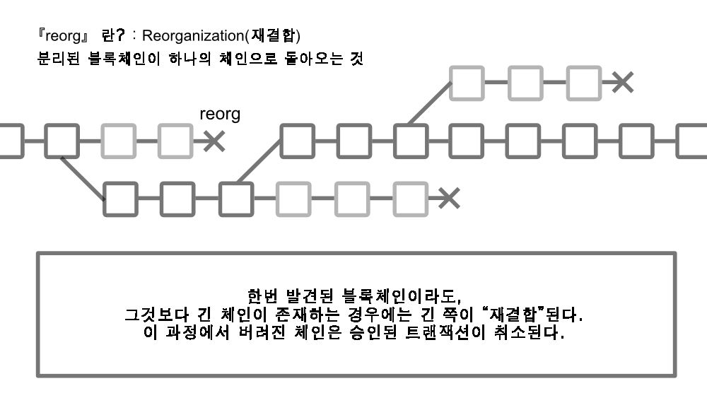 UASF에서 중요한 점은 "reorg" 라는 개념입니다. 이것은 특별히 UASF이나 블록 체인 용어가 아닌, Reorganization, 즉 "재구성"한다는 의미에서 블록체인에서는 "분리된 블록 체인이 하나로 합쳐지는 것" 을 말합니다.