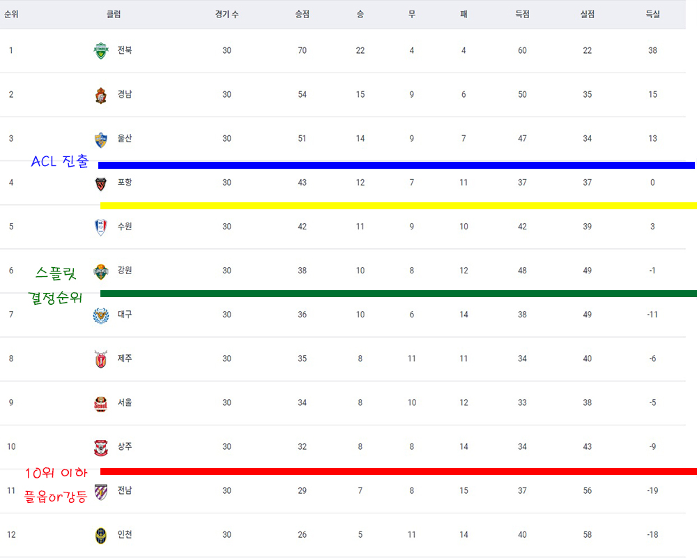 순위표를 살펴보면 현재 정규라운드가 3경기 남았는데 4위에서 6위 팀들이 순간 미끄러지면 상위 스플릿에 진출하는 팀들이 바뀔 가능성이 많고 6위부터 9위가 승점 4점차로 매우 치열합니다.