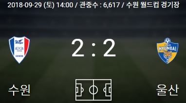 수원과 울산의 대결은 종료 10분전 수원의 반격으로 무승부로 끝났습니다. 경기를 보면 전체적으로 울산이 기회도 많았고 좋은 모습을 보여줬지만 계속 막판에 무너지는 모습은 개선해야하고 수원은 유효슛팅은 부족했지만 기회를 만드는 모습은 상당히 좋았습니다. 하지만 매 경기마다 빠른 교체에 대한 부분은 상대에 대한 파악이 부족하다는 생각이 들어서 꼭 고쳐야한다고 생각합니다.