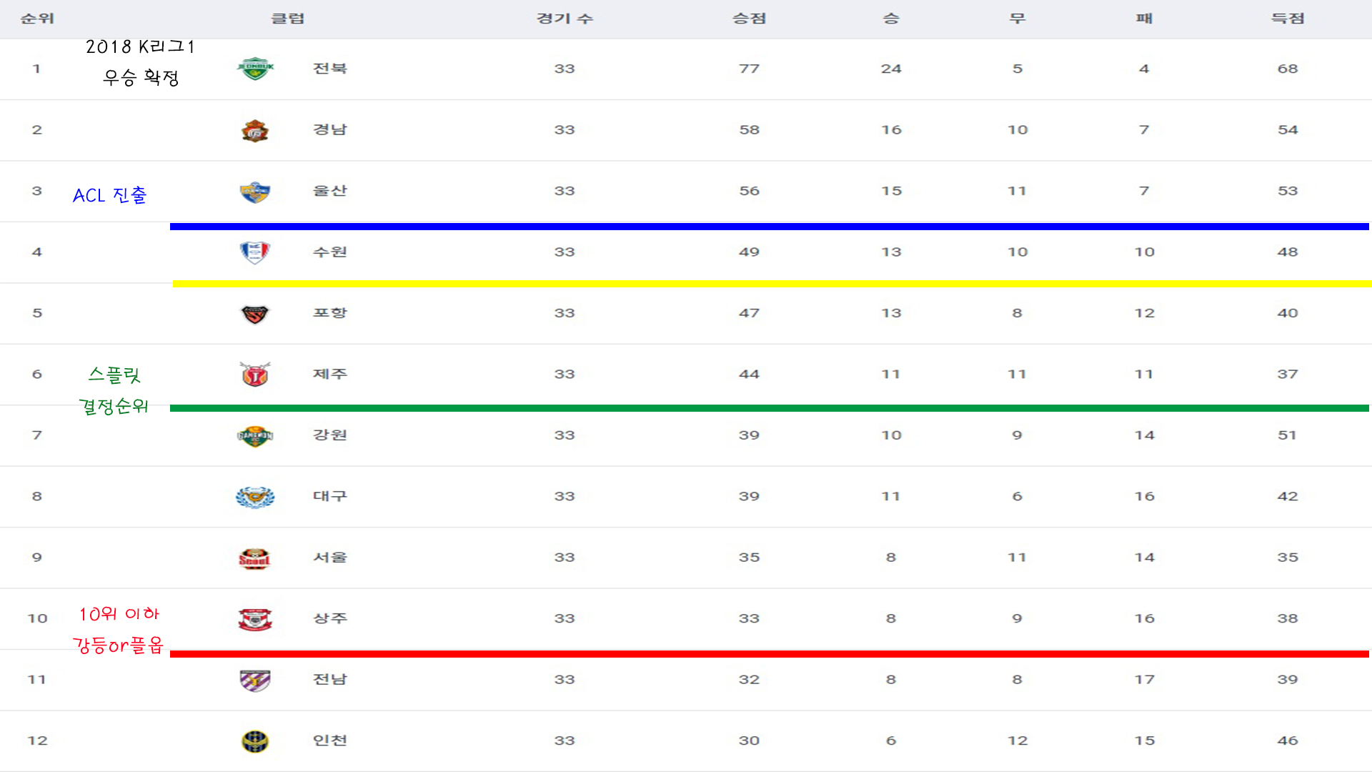 매 시즌 강력한 모습을 보여줬던 전북현대는 스플릿라운드에 들어가기전에 우승을 확정지었지만 ACL티켓과 강등이 남았으니 아직 리그는 끝나지 않았습니다.