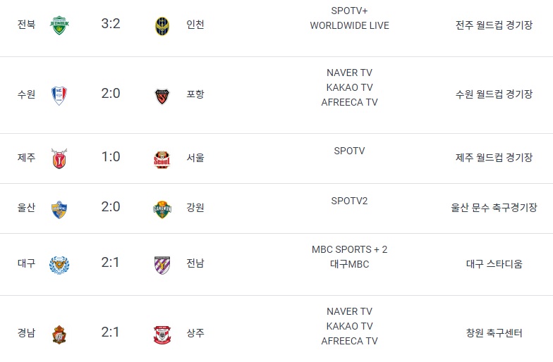전북 (1위) vs 인천 (12위) 경기결과: 3-2
