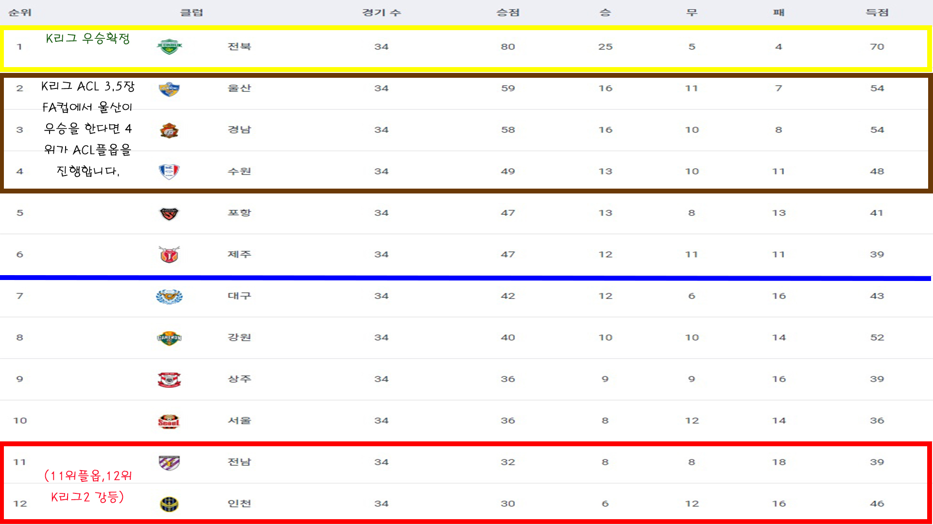 우승경쟁은 끝났지만 ACL티켓과 강등을 두고 펼쳐지는 스플릿라운드가 시작했습니다.
