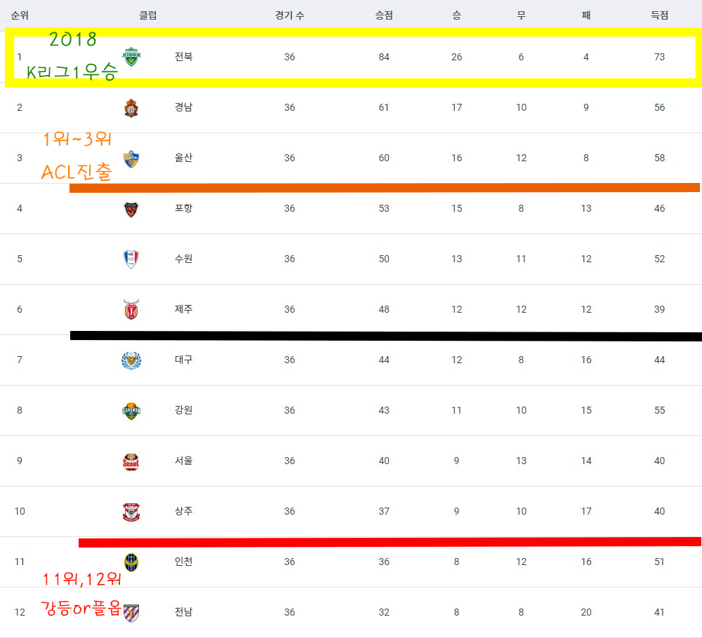 36R가 끝난 이후의 순위표입니다. 울산이 FA컵 결승에 올라간만큼 아직 4위에게는 ACL출전기회가 살아있고 특히 이번은 강등권싸움이 상당히 치열했습니다.