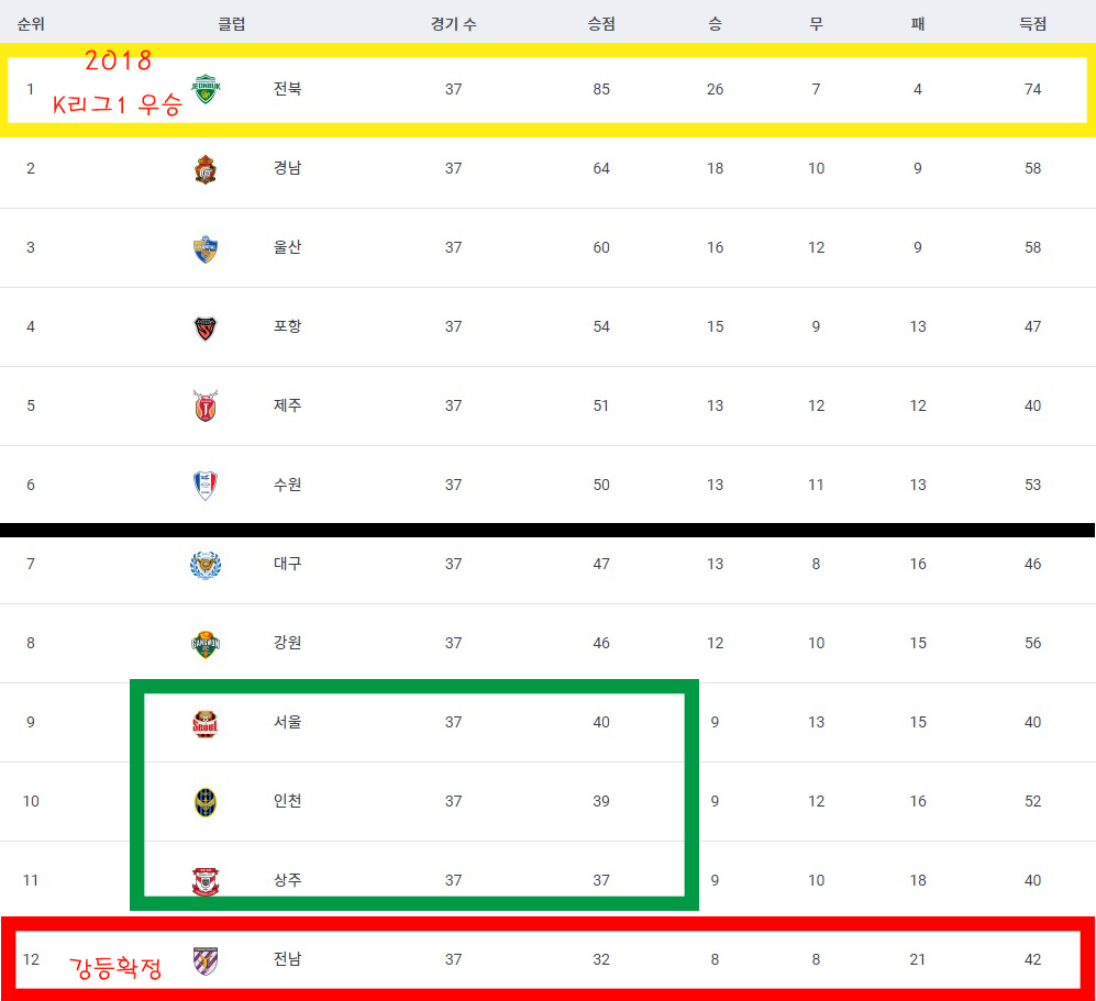 아쉽지만 이번 라운드를 끝으로 최초 강등 확정팀이 생겼는데 기업구단으로는 두번째로 전남 드래곤즈가 K리그2로 강등이 확정되었습니다.