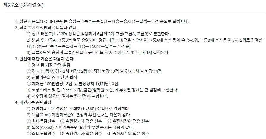 K리그 규정을 보면 승점➡다득점➡득실차➡다승➡승자승➡벌점➡추첨 이렇게 순위가 결정이 됩니다.