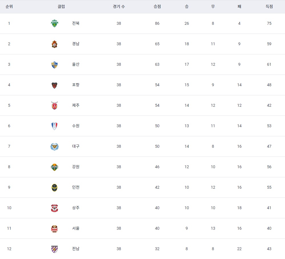 시즌 우승은 전북현대에게 돌아갔고 전남은 K리그2로 강등ㅠㅠ