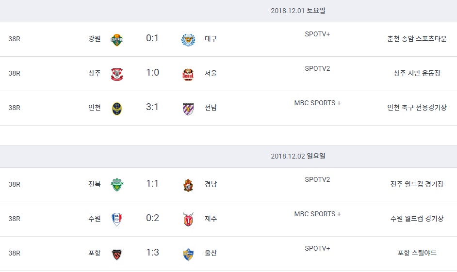 공식적인 K리그1 일정이 종료되었습니다.