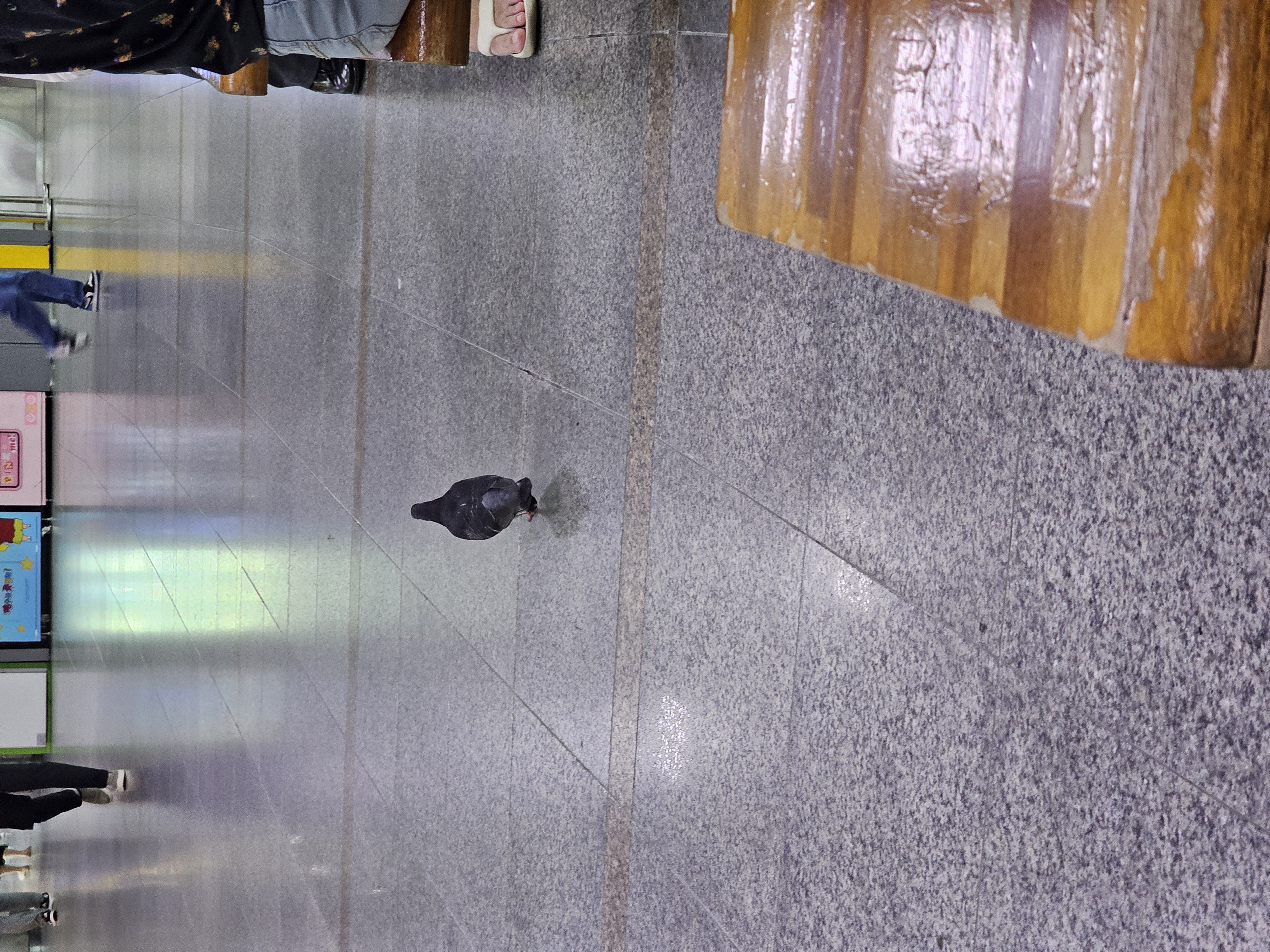 열차출발시간을 앉아서 기다리는 역사 내 벤치 주변을 서성이는 비둘기. 사람이 와도 별 신경쓰지 않는 눈치다. 손님들이 흘린 과자 등의 먹이사냥에 더 집중한다..