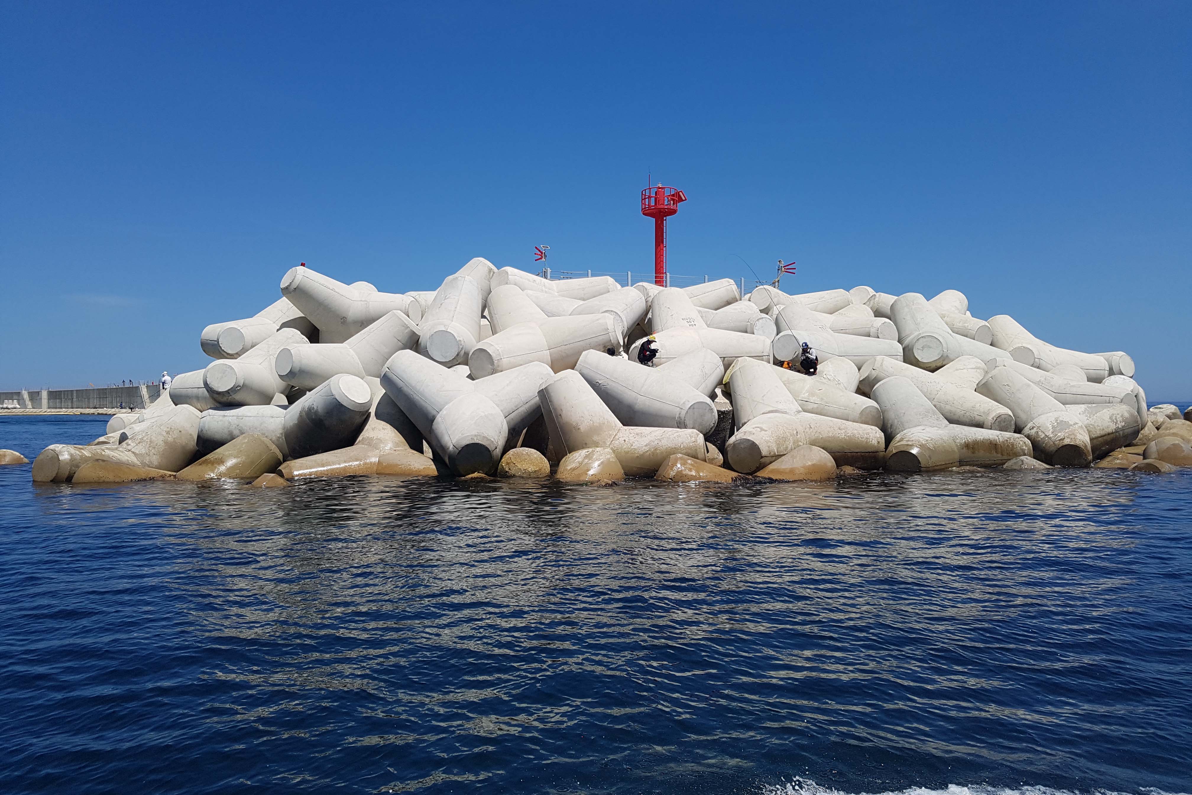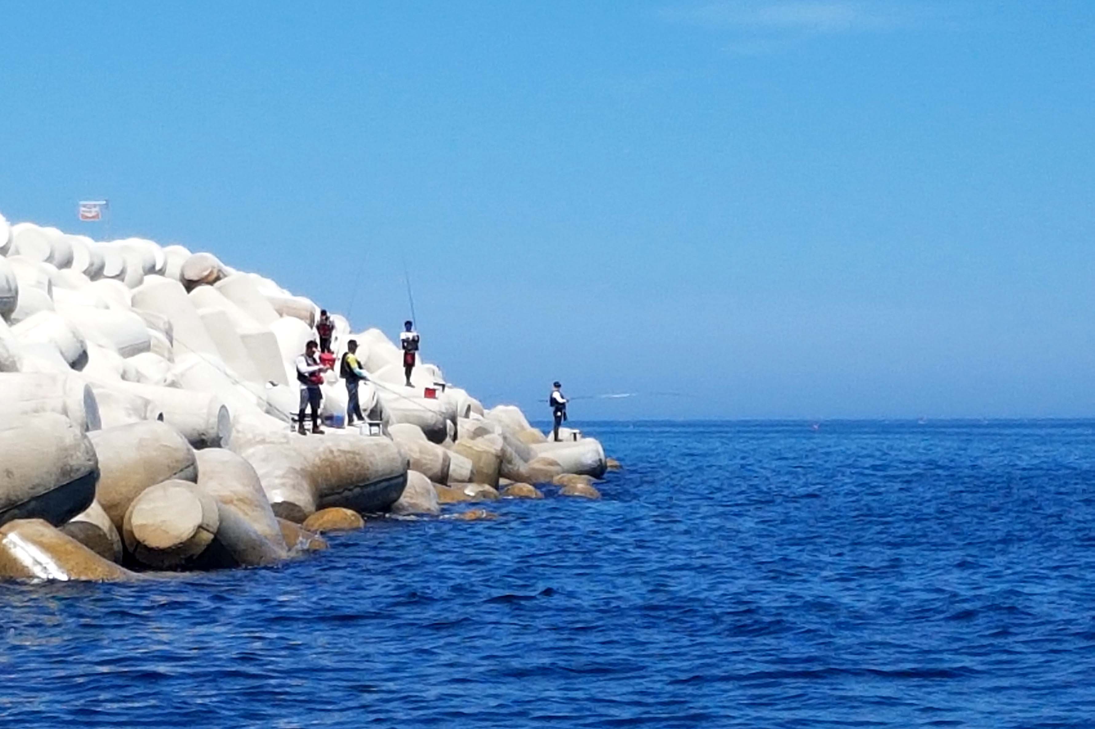 낚시인들이 옹기종기 모여있는 테트라포트를 지나고