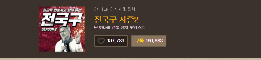 정봉주 전의원이 미투관련 방송을 그만두고 한달 전에 '최강욱의 전국구'로 진행자가 되었고, 지금은 모든 방송을 빠짐없이 다운 받아 듣고 있습니다. 사법개혁에 선봉에 있는 법조인이자 시민운동가여서 그런지 방송에 나오는 패널분들이 거의 전부 진보성향 법조인, 방송인, 민주당 정치인이지만 이런 편파적인 방송 듣기 아주 좋습니다. ㅎㅎ