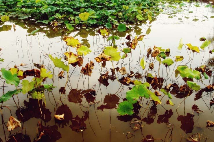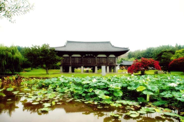 누각 앞에는 커다란 연잎 사이를 헤엄치는 오리 몇마리와