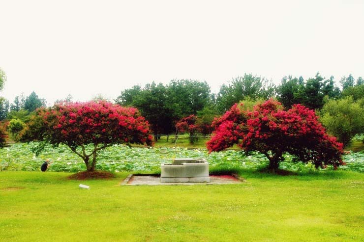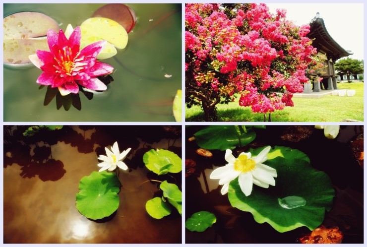 구품연지 가장자리에는 진분홍꽃 가득 피운 베롱나무 두그루가 나란히 서 있으며