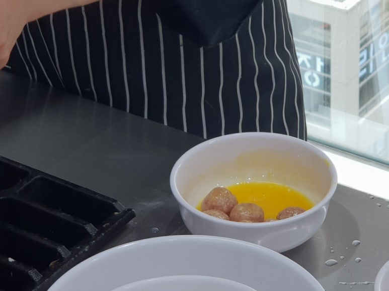 완자에 밀가루 살짝 뭍혀서 계란물에 퐁당담궈서