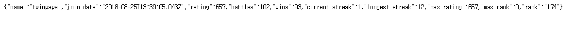 - 예시 : * {"name":"jayplayco","join_date":"2018-06-01T08:25:38.230Z","rating":271,"battles":15,"wins":11,"current_streak":2,"longest_streak":5,"max_rating":271,"max_rank":0,"rank":"289"}