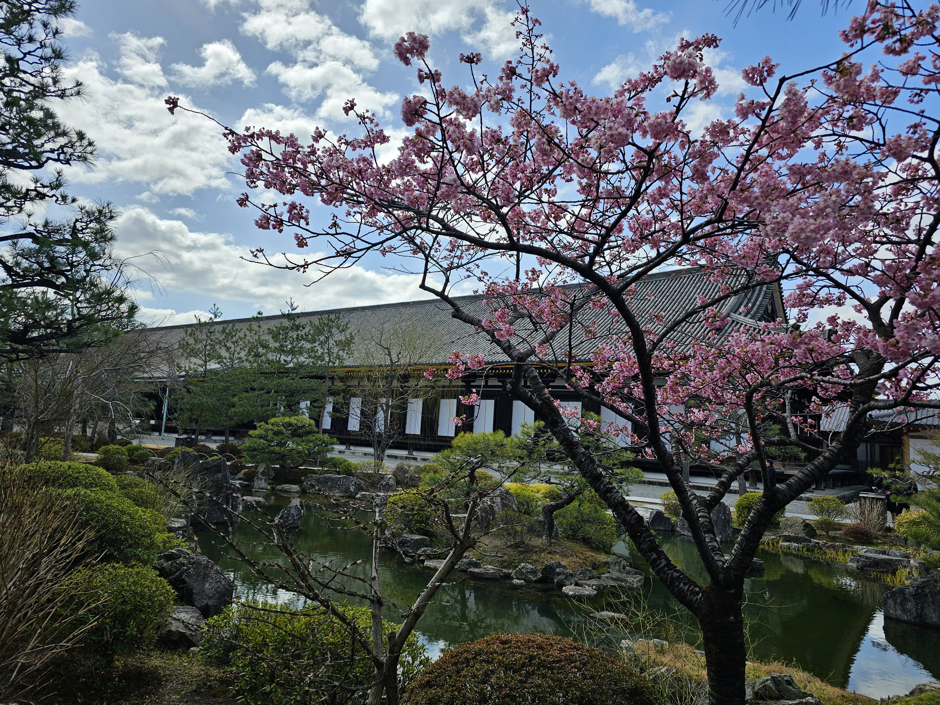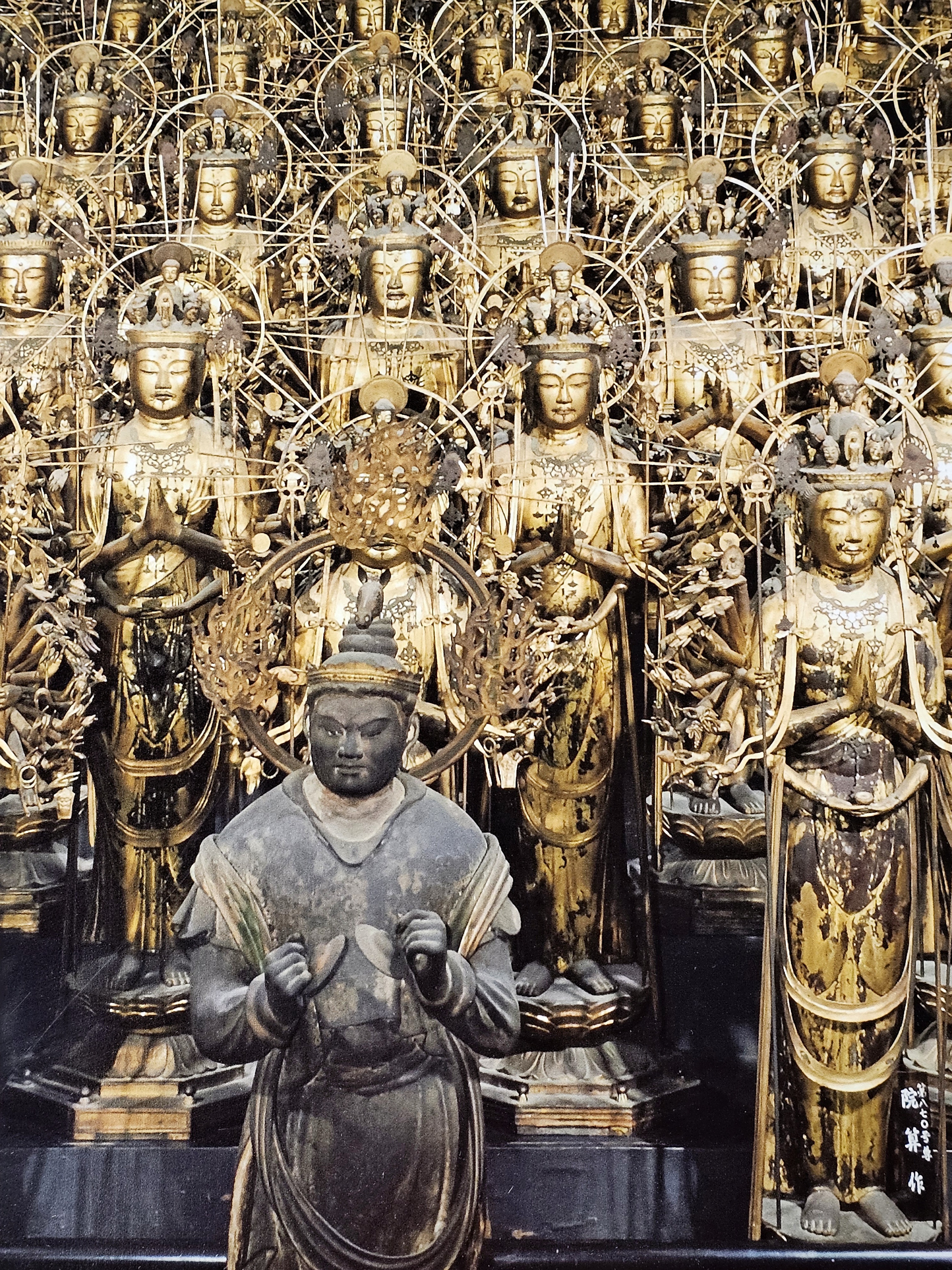 산주산겐도는 정면 33칸의 건물로 그 길이가 120m에 달한다. 현재의 건물은 1266년 화재로 인해 재건된 것으로 그 안에는 1001구의 천수관음입상과 28가지 모습을 한 수호신이 모셔져 있다.