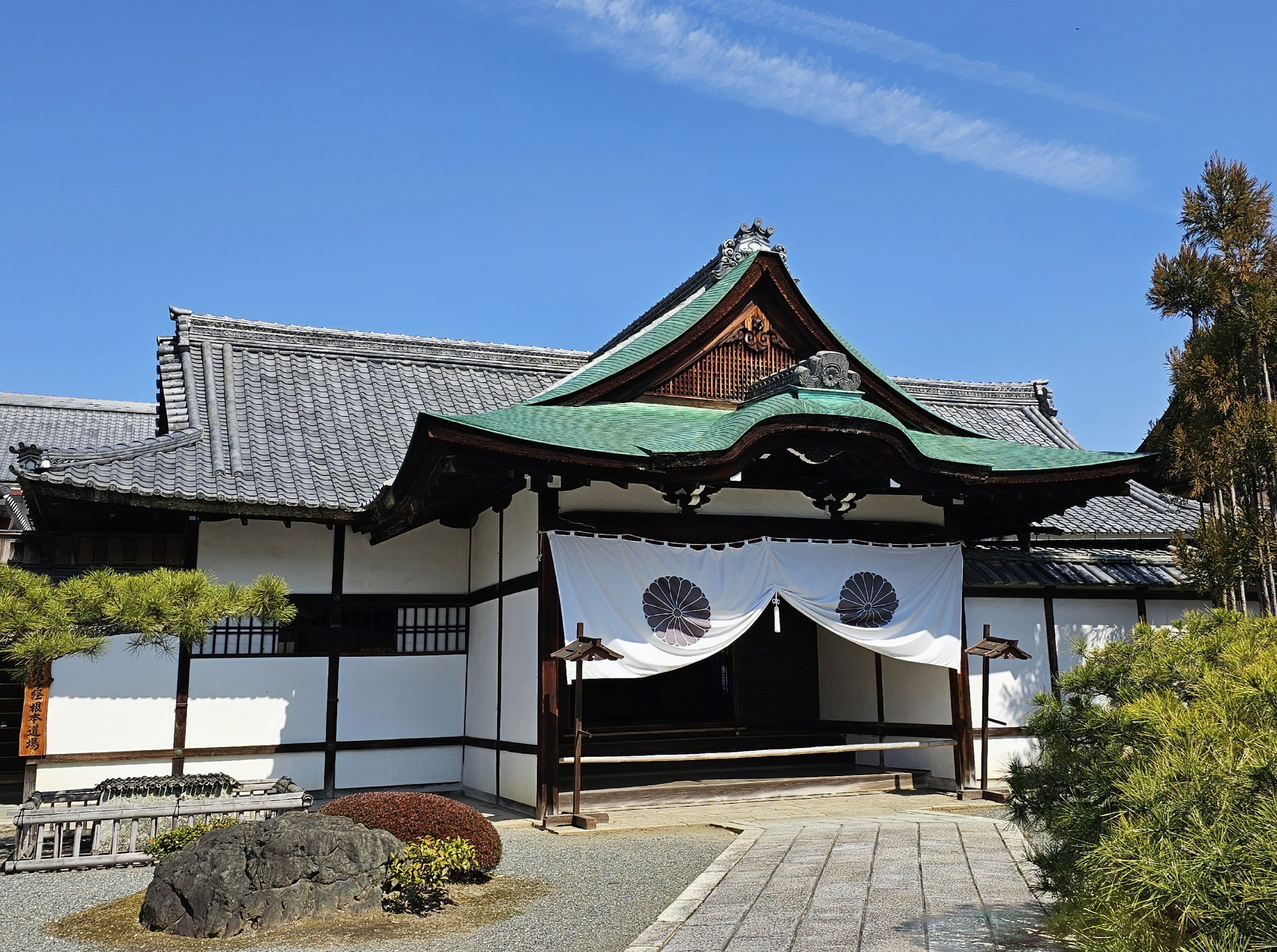 다이가쿠지는 헤이안 시대 초기 사가 천황의 별장으로 건립되었다가 876년 사찰로 바뀐 곳이다. 그래서인지 관람객이 드나드는 입구 옆의 현관에는 왕가의 상징인 국화 문양의 노렌이 걸려있다.