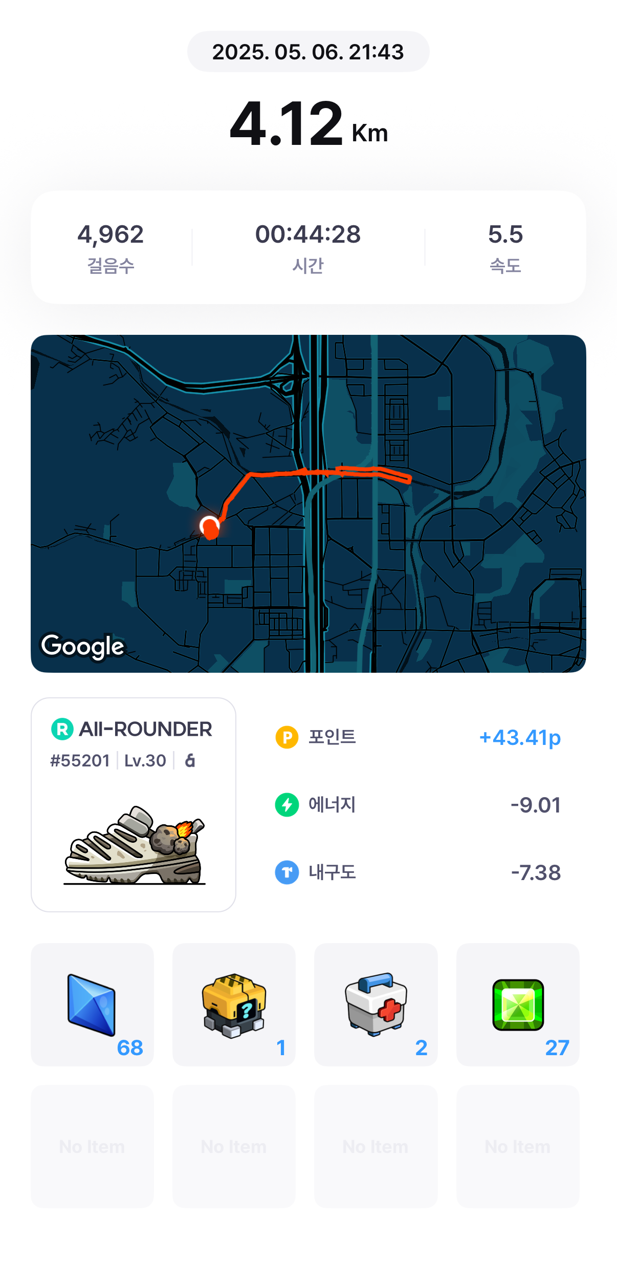 [m2e] 오늘 운동 완료 20250506jeongpd (54)in #kr • last year #오운완(20250506/4.12km/2km) #krsuccess #m2e #superwalk #stepn-kr #diary #aaa