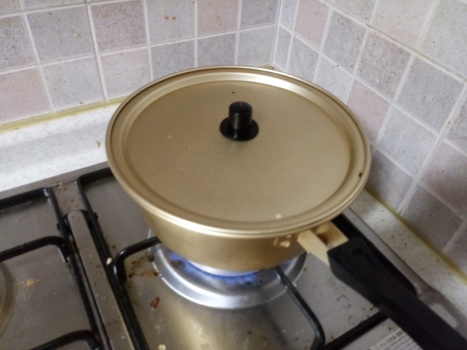 뚜껑을 닫습니다! (물이 없어서 이래야 계란이 익어요 증기로 익힌다는 느낌)