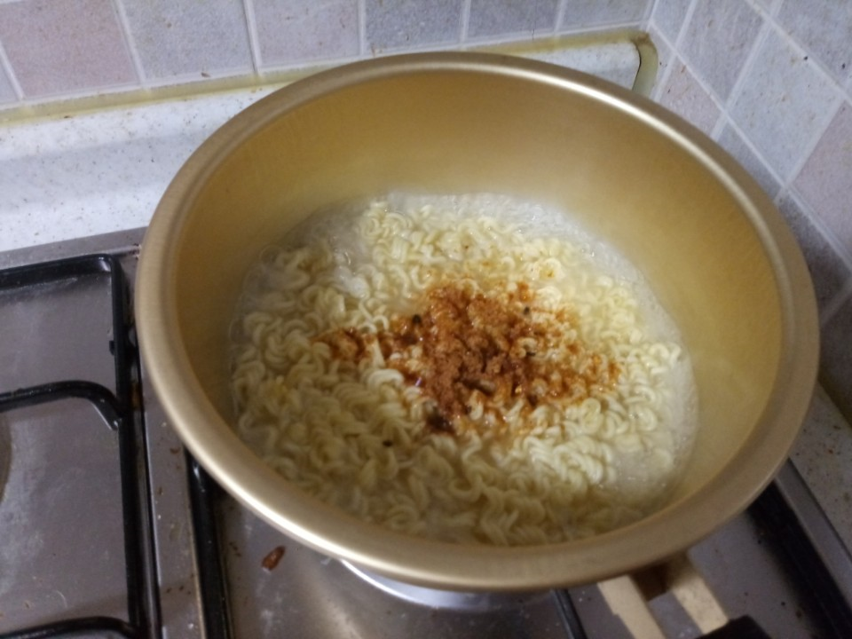 만화에 나온 어떤 쿠지라이라는 사람이 해먹어서 이름이 쿠지라이식 라면이라고 붙은거 같아요 해먹어 봤더니 오.. 평소 끓여먹던 라면이 조금 질린다면 한번쯤 해먹어 볼만합니다 쉽고 맛있어요! 레시피로 들어가자면 일단 적은양의 물을 넣고 면을 끓입니다! 물이 없어서 이게 시간이 좀 걸려요