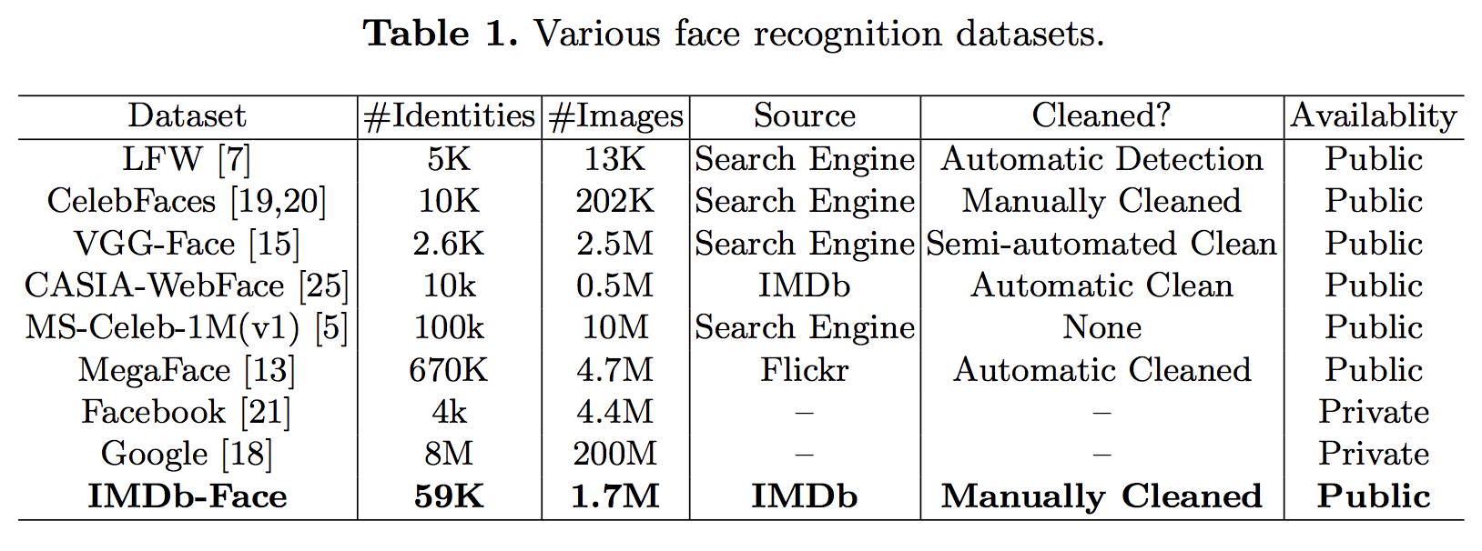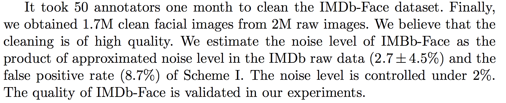 아시겠지만, 얼굴 인식 데이터 베이스는 일종의 검색 알고리즘 기반 클롤러를 이용하여 모으는 경우가 많고, 그 크기가 크기때문에 노이즈 합니다. 논문에서 제시한 바와 같이 그 노이즈는 쉬운 노이즈도 있지만, 사람이 봐도 쉽지 않은 노이즈도 많이 있죠. 또한 아래 표와 같이 그 크기도 방대하고, 포함하고 있는 사람의 수(Identities)도 엄청납니다. 그래서 이 논문에서 노동력을 기울여 만든 IMDb-Face 말고는 자동화된 정제 방식을 사용하고 있습니다. (1.7M장을 사람한테 정제 시키는 중국의 노동력 클라스!!!)