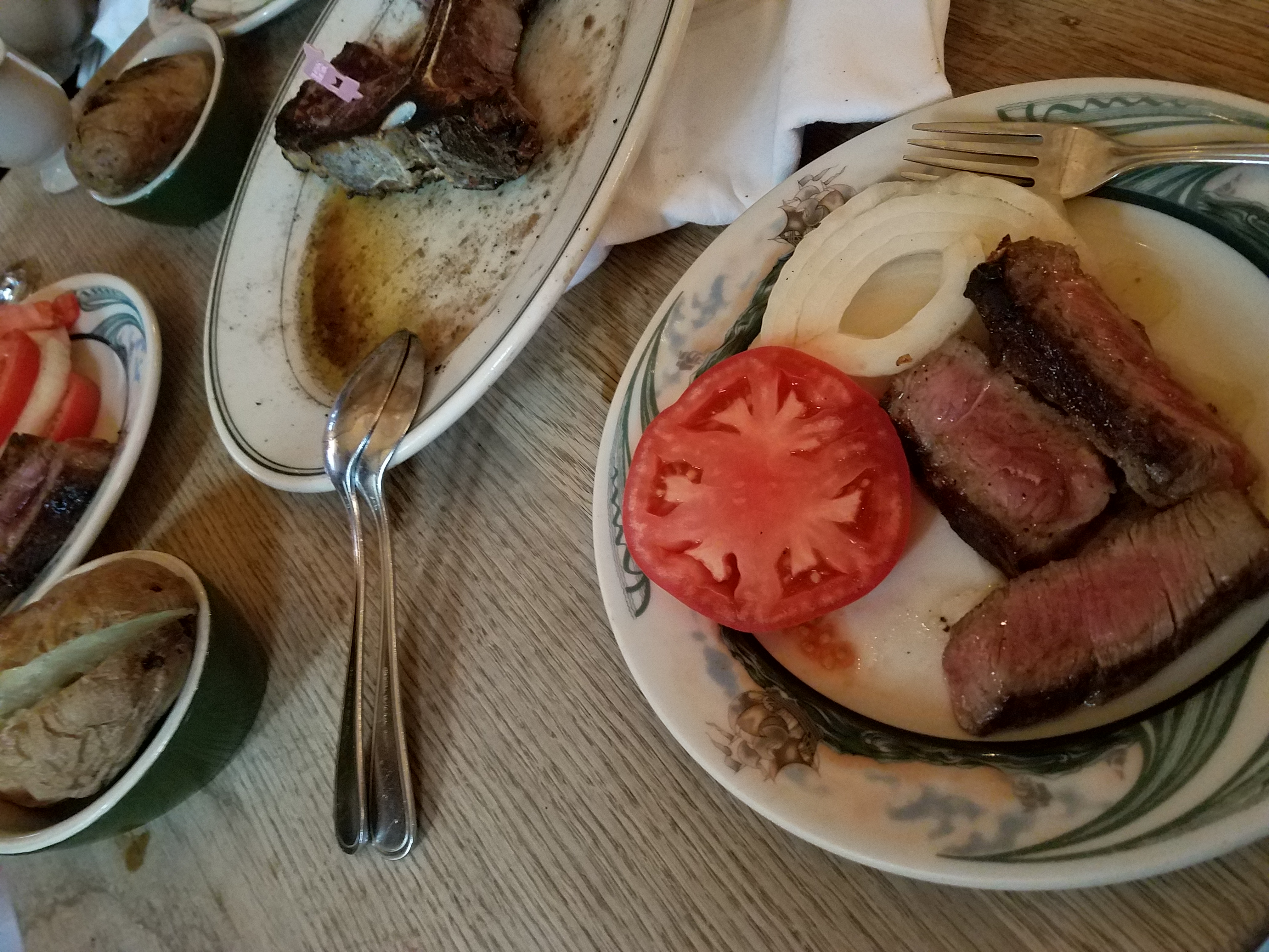 저와 같이 간 일행은 스테이크 하고 사이드로 베이컨, 감자, 토마토, 그리고 양파를 주문 했습니다. 토마토와 양파는 나중에 입 가심을 위해서 시킨다고 하네요. 베이컨은 결국 삼겹살은데 불 맛이 조금 나는거 빼고는 다른게 없었습니다.