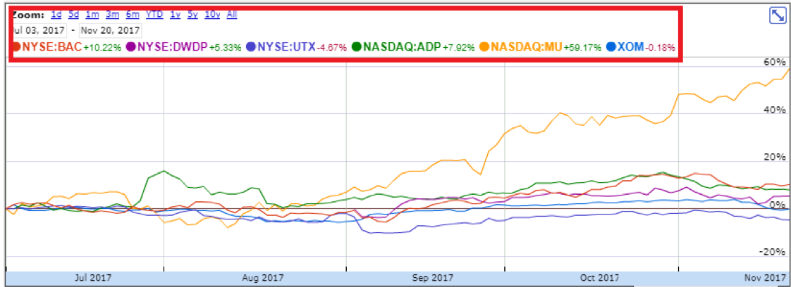 다음은 이번 2017년 3분기내 르네상스가 테크놀로지스가 추진했던 상위 7개 신규 매수 (new purchase) 주식들로서 XOM (Exxon Mobil), FDX (FedEx), MU (Micron Technology), ADP, UTX, DWDP (DowPupont), Bank of America (BAC)의 최근 주가 수익률을 다음과 같습니다.