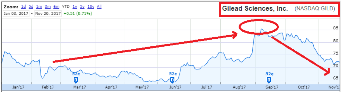 흥미롭게도 르네상스 테크놀로지스의 투자 관심에도 최근까지 미미한 주가 수익률을 기록중에 있는 북미 증시내 대표 바이오 제약주, 길리어드 사이언스 (Gilead Science: GILD)는 이후 주가 상승세를 달성하는듯 싶더니 2017년 9월 기점으로 급락세로 전향하고 있습니다. 이런 가운데 2017년 3분기 기준 여전히 르네상스 테크놀로지스 전체 포트내 랭킹 2위 (약 $830 million달러 투자 베팅)를 고수한다는 점에서 르네상스 테크놀로지스 퀀트 모델은 길리어드의 최근 주가는 ‘oversold’ 되었다는 가능성을 간접적으로 시사하고 있습니다.