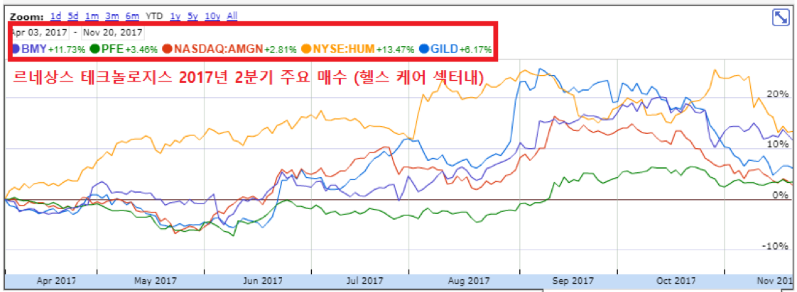 다음은 지난 2017년 2분기내 르네상스가 추진했던 주요 매수 주식들과 이들의 최근 주가 흐름에 대해서도 간단히 살펴보도록 하겠습니다. 호기심 차원에서 2 그룹 (헬스 케어 섹터내 주요 매수 주식들 vs. ‘비’헬스 케어 섹터 관련주들)으로 재분류해보았습니다.