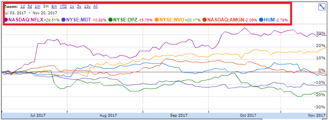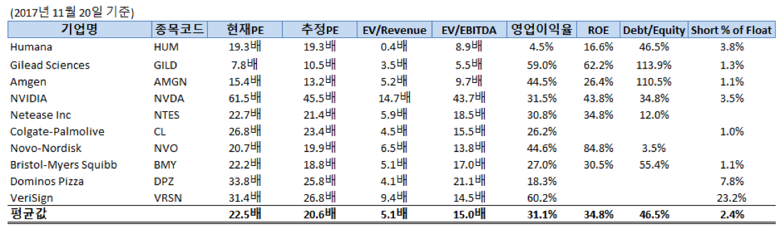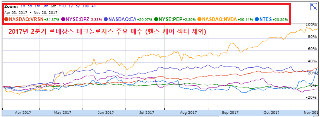 헬스 케어를 제외한 기타 섹터별 주요 매수 주식들로는 넷이즈 (NetEase: NTES), 콜게이트 파모리브 (Colgate-Palmolive: CL), 엔비디아 (NVIDIA Corp: NVDA), 펩시 (PepsiCo: PEP), 일렉트로닉 아츠 (Electronic Arts: EA), 도미노 피자 (Dominos Pizza: DPZ), 베리사인 (VeriSign: VRSN)등이 선정되며 이들의 2017년 2분기 이래 최근까지 주가 수익률을 나타낸 그래프는 다음과 같습니다.