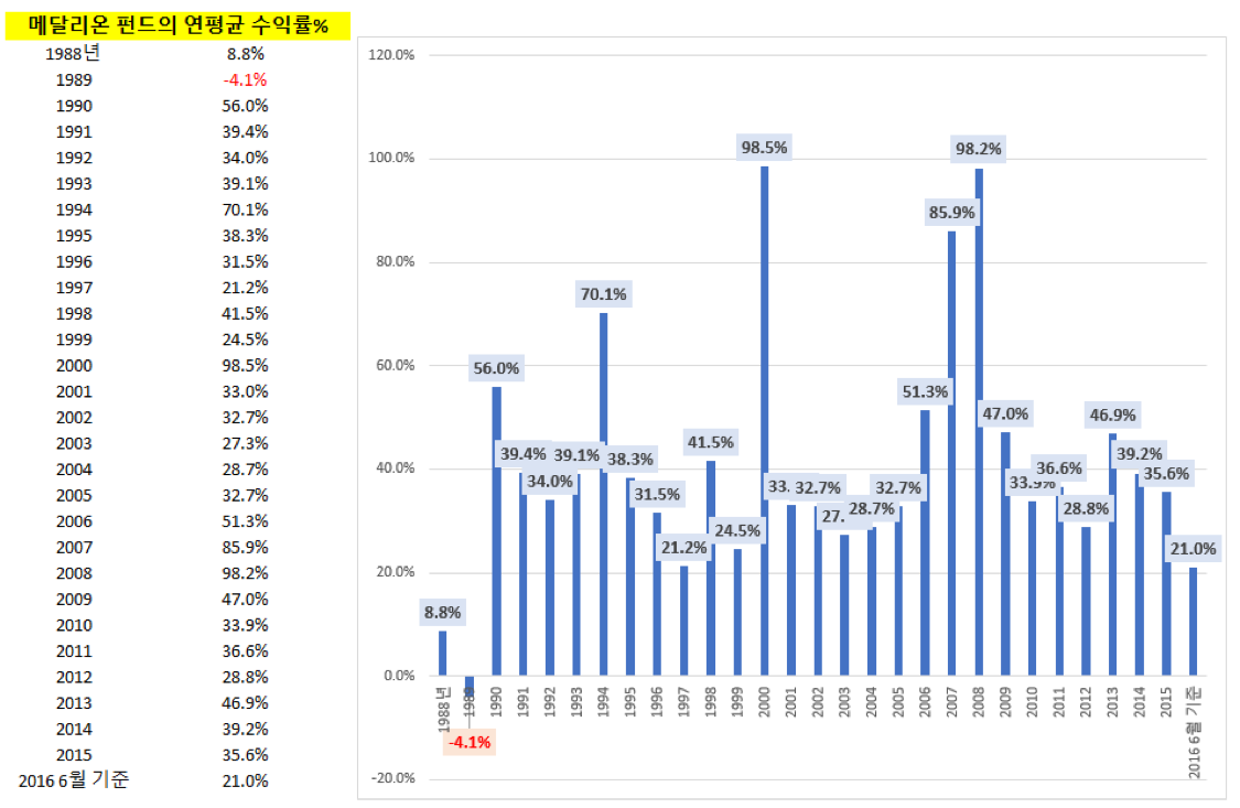 여러 펀드 중에 망한 펀드도 있지만, 메달리온 펀드는 정말 수익률이 엄청나네요