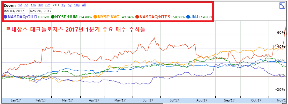 지난 2017년 1분기내 르네상스가 추진했던 상위 5개 주요 매수 주식들은 다음과 같으며, 이후 이들의 최근까지 주가 흐름은 아래 그래프와 같습니다.