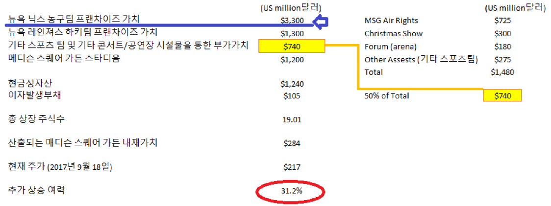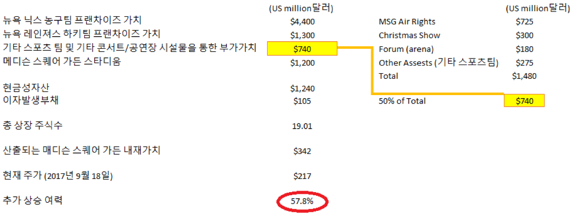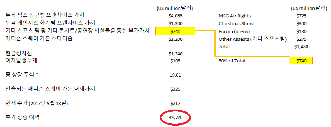 물론 포브스가 산정한 뉴욕 닉스와 뉴욕 레인져스의 팀 가치는 Enterprise value라는 점에서 위의 산출 방식에서 중복되는 부분도 있겠으나, 매디슨 스케어 가든의 기타 부가가치 자산들에 대한 50%만을 감안한 점에서 큰 무리는 없을 것으로 판단됩니다.