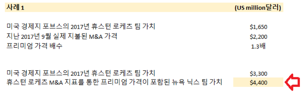 첫번째 연습으로 만일 뉴욕 닉스 팀 가치가 지난 휴스턴 로케츠 팀 가치가 누렸던 미국 포브스 산출 팀 가치 대비 1.3배 프리미엄에 평가된다는 가정하에 아래와 같이 뉴욕 닉스 팀 가치 산출 과정을 요약했으며, 이번 사례를 통해 산출된느 뉴욕 닉스 팀 가치는 약 $4,400 million 달러 수준입니다.