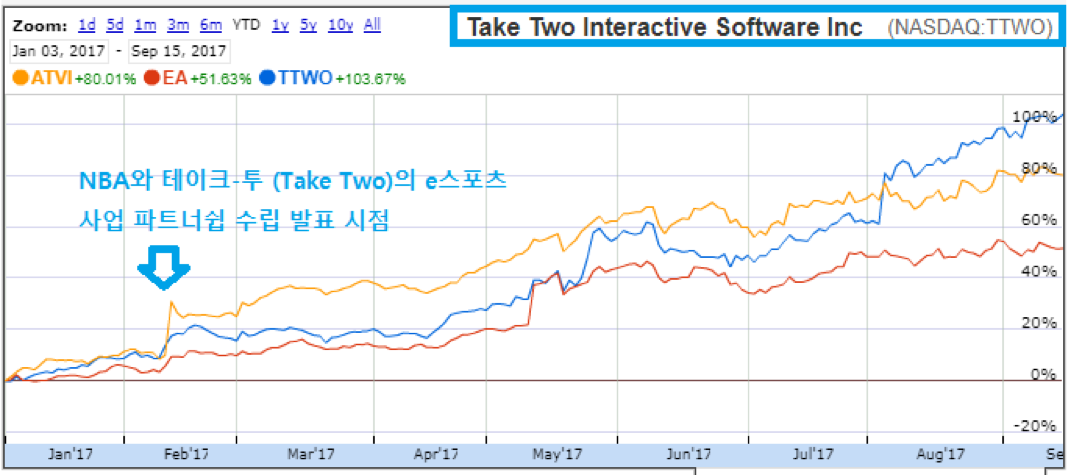 이번 2018년 첫 개최될 NBA e스포츠는 미국 프로 스포츠 리그에서 주관하는 첫번째 공식 e스포츠라는 점에서 전세계 게이머들은 물론, 글로벌 투자자들의 높은 관심을 주목받고 있는 가운데 지난 2017년 2월 이래 테이크-투 인터랙티브의 주가를 살펴볼때 나름 낙관적 투자 관점이 지속되고 있는 것으로 판단됩니다.