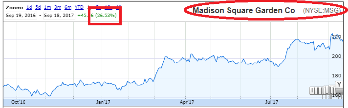 지난 2016년 2월 26일, “프로 농구/하키 스포츠 경기에서 유명 아티스트 콘서트까지 한자리에 – 매디슨 스퀘어 가든”이라는 제목의 분석글을 공유해본 이후, 2017년 9월 18일 최근까지 +43.84% 주가 상승률을 달성중에 있는 매디슨 스퀘어 가든의 주가는 최근 휴스턴 로케츠 M&A 관련 지표들을 감안해볼때 여전히 흥미로운 주가 수준에 평가된다는 점이 파악됩니다.