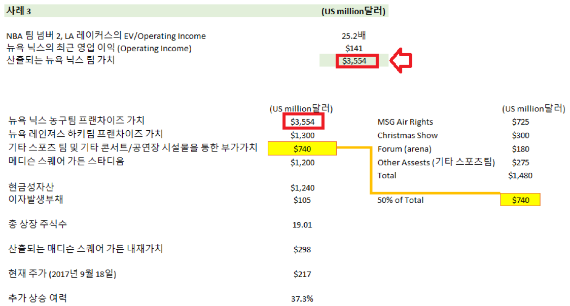 이를 토대로 사례 1에서와 같이 다른 입력 수치를 그대로 유지한 가운데 뉴욕 닉스 팀 가치만을 새로 대입한 결과 매디슨 스퀘어 가든의 내재가치는 1주당 $325달러로 현재 주가 $217 달러 대비 약 +49~50% 추가 상승 여력이 존재하는 것으로 분석됩니다.