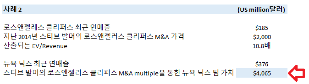다음으로는 지난 2014년 스티브 발머의 로스앤젤레스 클리퍼스 M&A 매입 가격을 벤치마크로 산출한 것이며, 산출되는 뉴욕 닉스 팀 가치는 아래 테이블과 같이 약 $4,065 million달러로 계산됩니다.