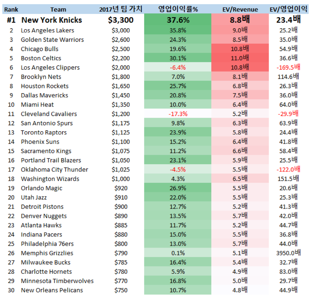 앞서 언급한대로 미국 유명 경제/투자지, 포브스 (Forbes)는 매년 미국 프로 농구 (NBA) 팀들의 가치 평가 자료를 발표하고 있으며, 가장 최근 2017년 미국 프로 농구 팀 가치 분석 자료를 요약한 테이블은 다음과 같습니다.