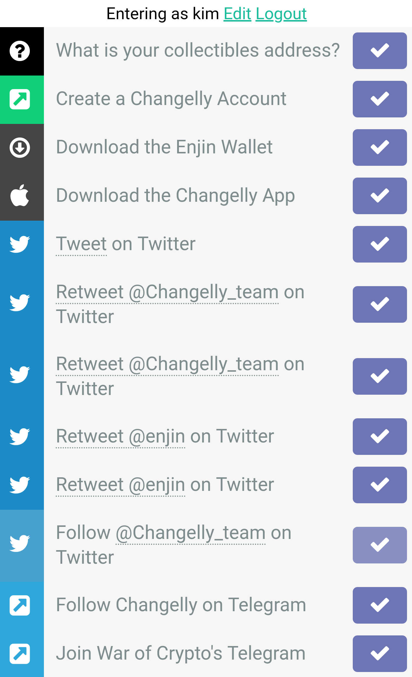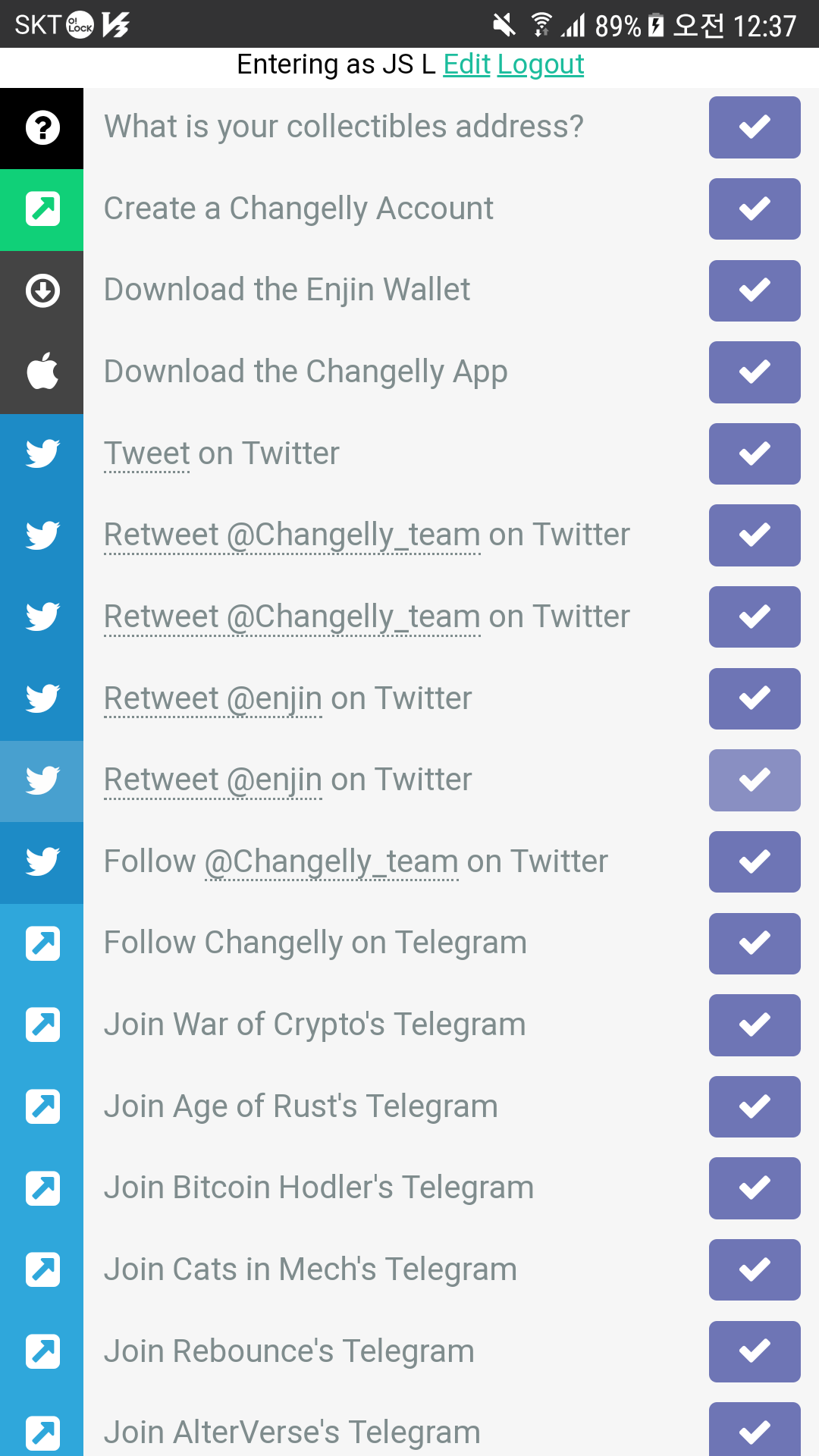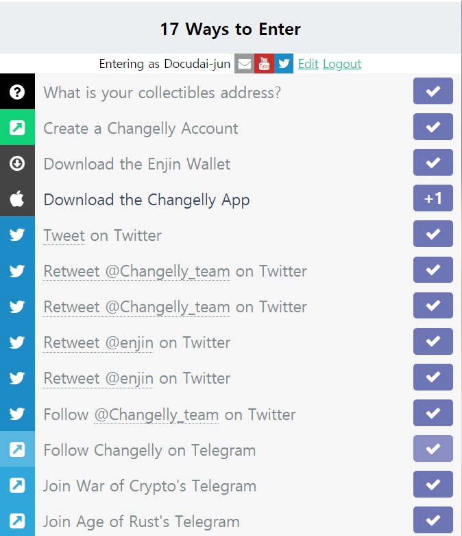TIP 타 운영 체제 월렛 설치 안해도 클릭 후 다시 클릭하면 체크되고, 하단의 트위터와 텔레그램 항목이 쭈욱 나옵니다. 개인적으로 텔레그램을 자주 사용해서 텔레그램만 쉽게 체크할 수 있었습니다. 트위터까지 가능하신 분은 트위터도 해서 최대 17의 엔진(Enjin) 멜팅(Melting) 드랍을 받아보세요 😊