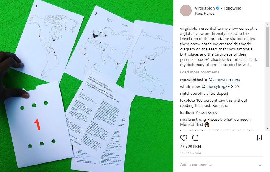 버질 아블로는 이번 루이비통 쇼의 모델 출생지와 부모의 국가를 보여주는 지도 다이어그램을 만들었고, 이는 참석자의 각 자리에 배포되었다.