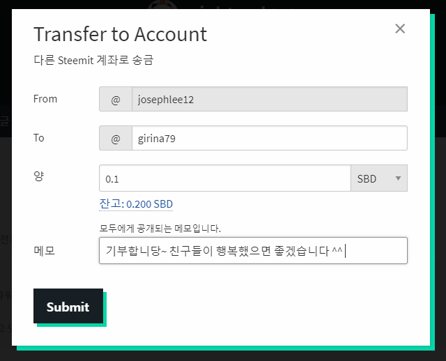 지갑전송을 하는 방법을 통해서 친구들에게 기부를 해볼 수 있었고. (- 0.1 SBD)