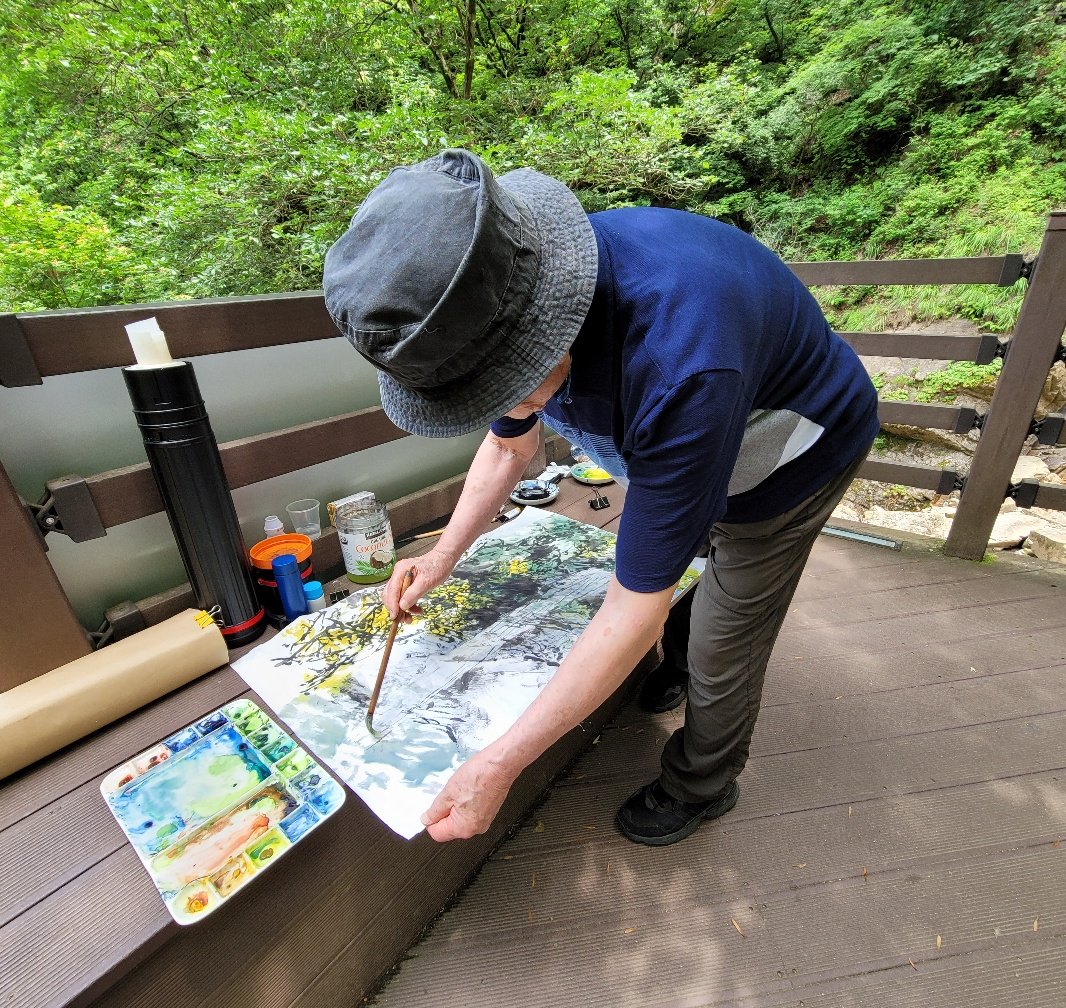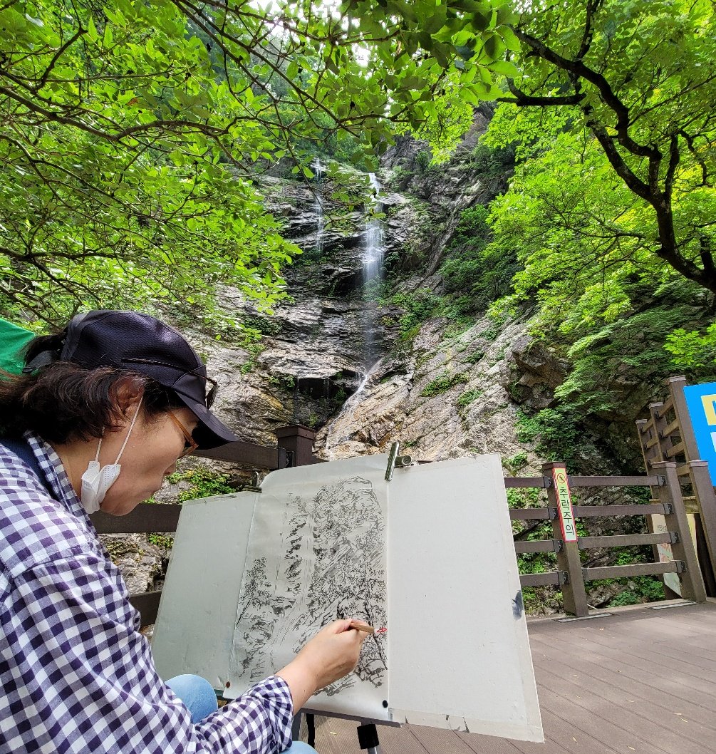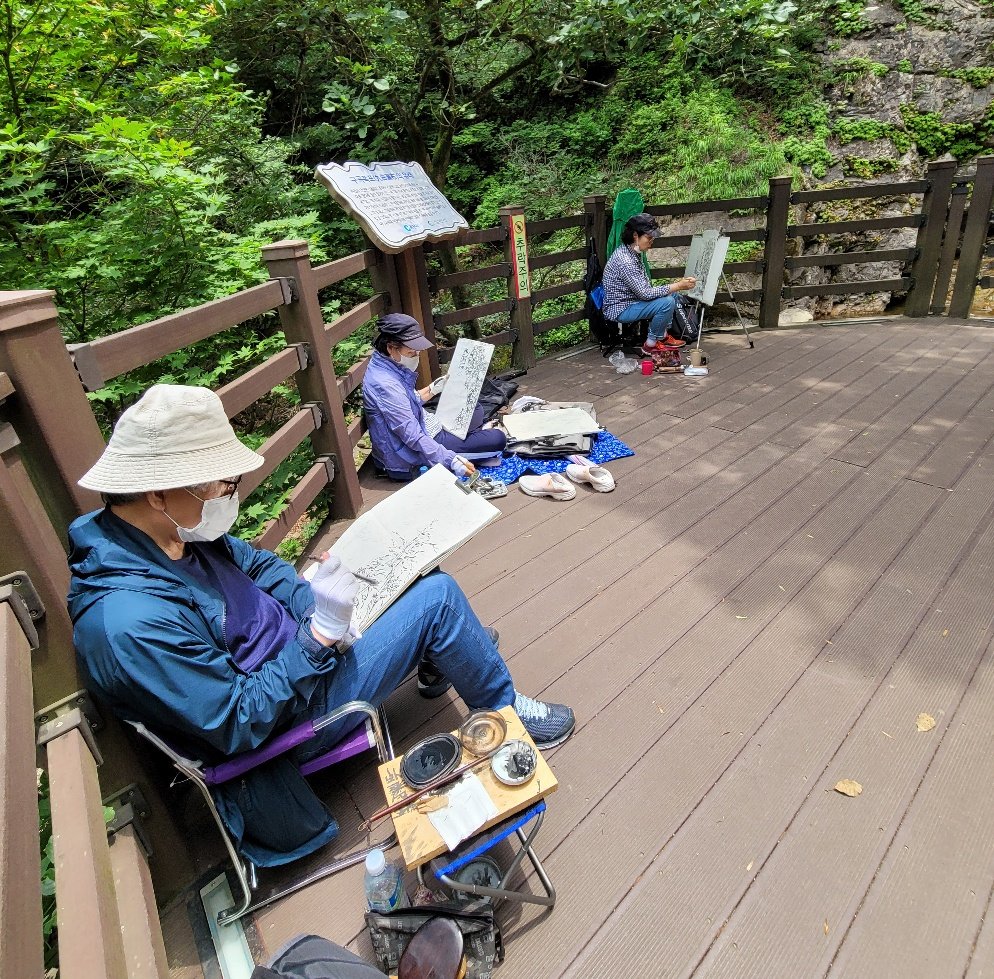 멋진 인생jsj1215 (86)in #kr • 5 years ago 자연속에서 만난 예술가들 동호회일까? 동년배로 보이는 나이 지긋한 분들이 폭포 아래에 옹기종기 모여 동양화를 그리고 있습니다. 수채화인듯 다른듯 보이는데 한지에 그리는 동양화랍니다. 취미활동을 이렇게 멋지게 하고 계시는 분들을 만나니 제 기분마저 좋아지고 고급진 시간속으로 들어온 느낍입다. 가변게 인사하고 몇마디 주고 받으며 유쾌해 집니다. 자연과 더블어...너무좋은 아름다운 모습들 잠깐이지만 좋은 만남이였습니다.