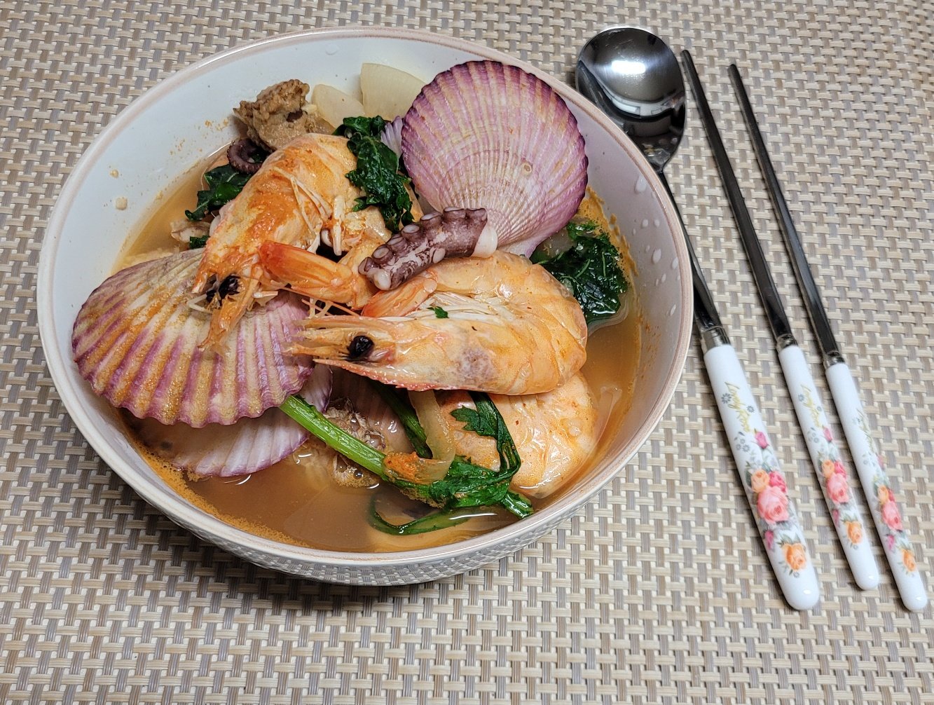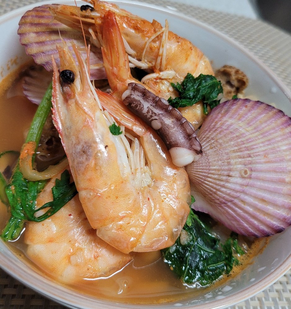 간만에 해물탕 만들었어요jsj1215 (86)in #kr • 5 years ago (edited)정말 오래간만에 해물탕을 만들어 보았습니다. 아이들이 고기를 좋아하다 보니 해물 요리는 별로 안하게 되네요. 슈퍼에 가서 눈에 들어오는 해물을 대충 사왔습니다. 무와 쑥갖 그리고 깻잎을 넣고 얼큰하고 시원하게 끓여봤답니다. 가리비는 속살이 그다지 크지 않았는데 껍질이 무지 예쁘네요. 낙지는 늘 그렇지만...별루 산낙지가 최고죠 ㅎ 입맛이 없고 속이 느끼할때 얼큰한 해물탕 최고입니다^^