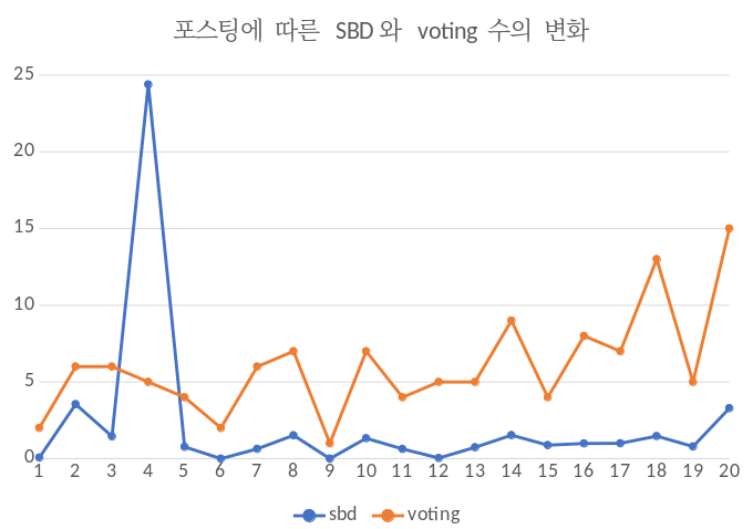 그래프에서 하나 눈에 띄는 점은 보팅 수의 완만한 상승세입니다. 이것은 제 경우도 감으로 느끼고 있었던 것이 최근들어 팔로워 숫자가 늘어나면서 댓글 역시 좀 더 많이 달린다는 느낌을 받았습니다. 하지만 보상 금액은 별다른 상승세를 보이지 않고 있습니다.