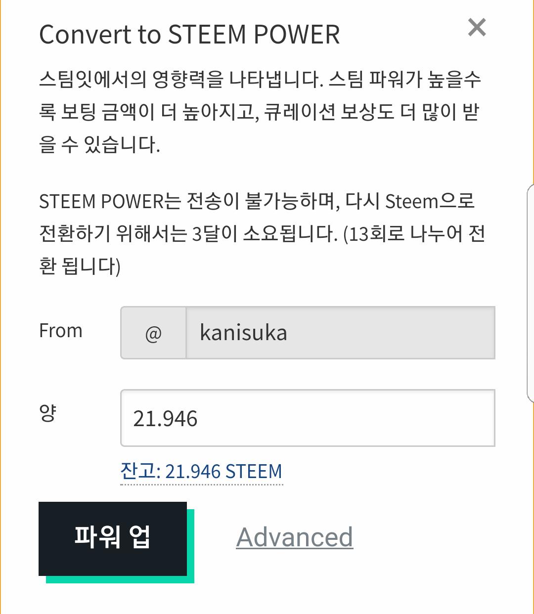 파워 업 메뉴에서는 내가 스팀파워로 변환하길 원하는 양만큼의 스팀 가격을 입력합니다.