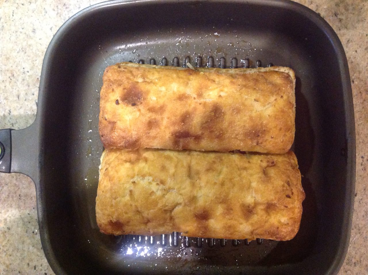 그릴팬을 달군후 만들어 놓은 빵을 얹고 무거운 냄비나 뚜껑으로 눌러서 치즈가 녹을때 까지 구워주세요.
