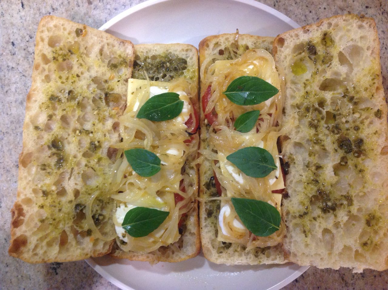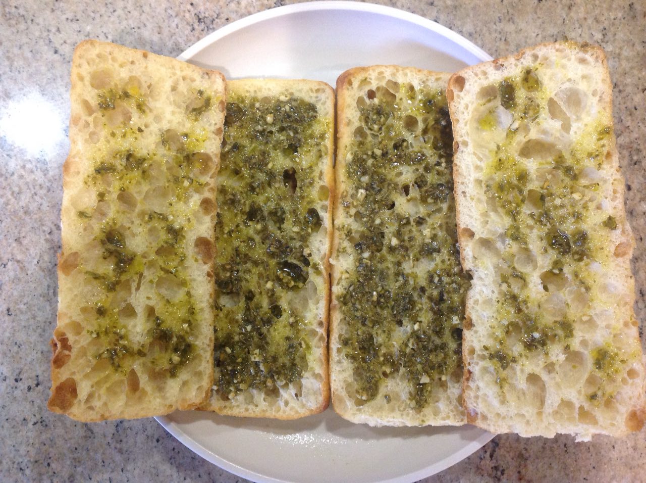 치아바타를 가르고 양면에 바질페스토를 바른후 슬라이스한 토마토와 바질잎을 얹어주세요.